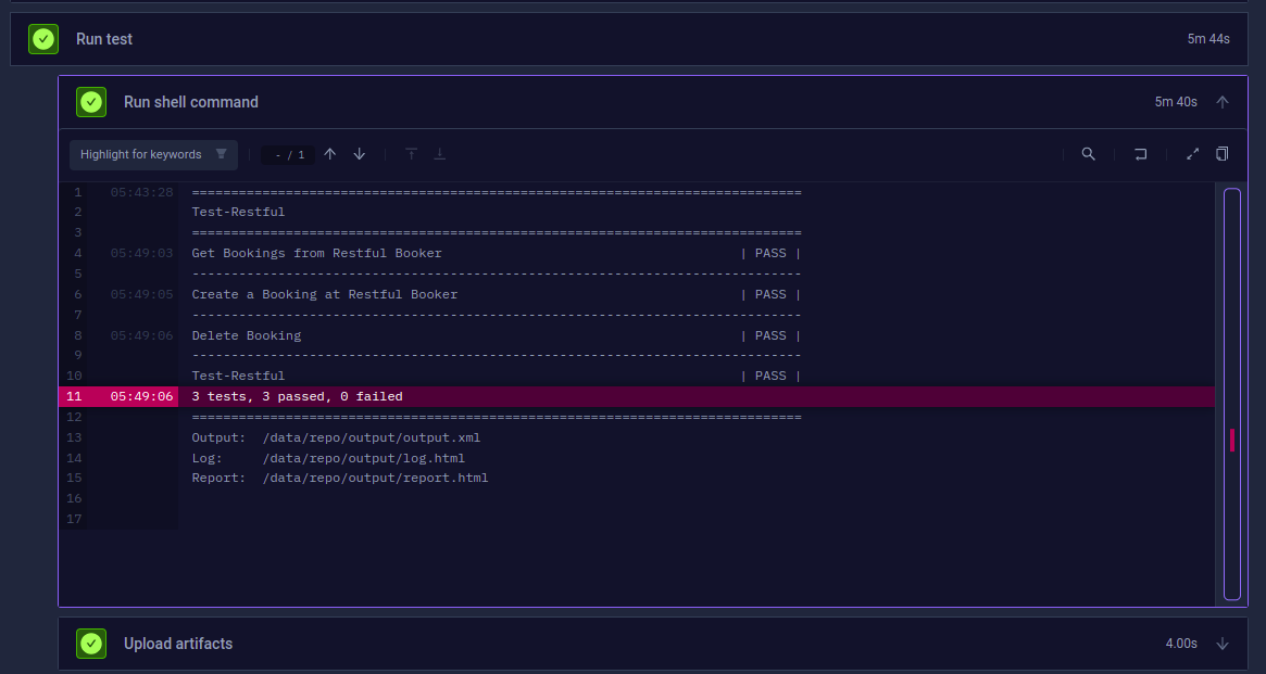 - Shell command: By default, the repository that has the test case is mounted to the /data/repo directory. We will use the robot command line tool to execute the test, and using the –outputdir option, we will save the output to a specific location. Here is the shell command: robot --outputdir /data/repo/output /data/repo/test-restful.robot.
