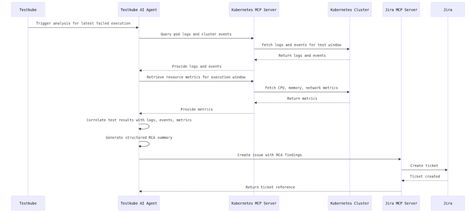 The full agent workflow, in sequence, is as follows. The agent receives a trigger from Testkube to analyze the latest failed execution. It queries pod logs and cluster events through the Kubernetes MCP Server, retrieves resource metrics for the test execution window, and correlates these signals with the test configuration and results. Based on this analysis, the agent generates a structured RCA summary and creates a Jira ticket through the Jira MCP Server with the investigation findings attached. This can be further understood by the image below.