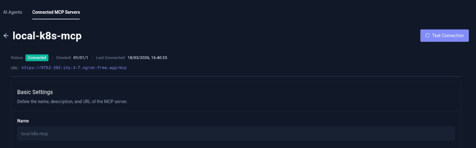 Note: In this example, the MCP server is running on a local machine. To make it accessible to Testkube, it is exposed using Ngrok, which provides a temporary public URL. If the MCP server is hosted publicly, you can directly provide the MCP server endpoint URL.