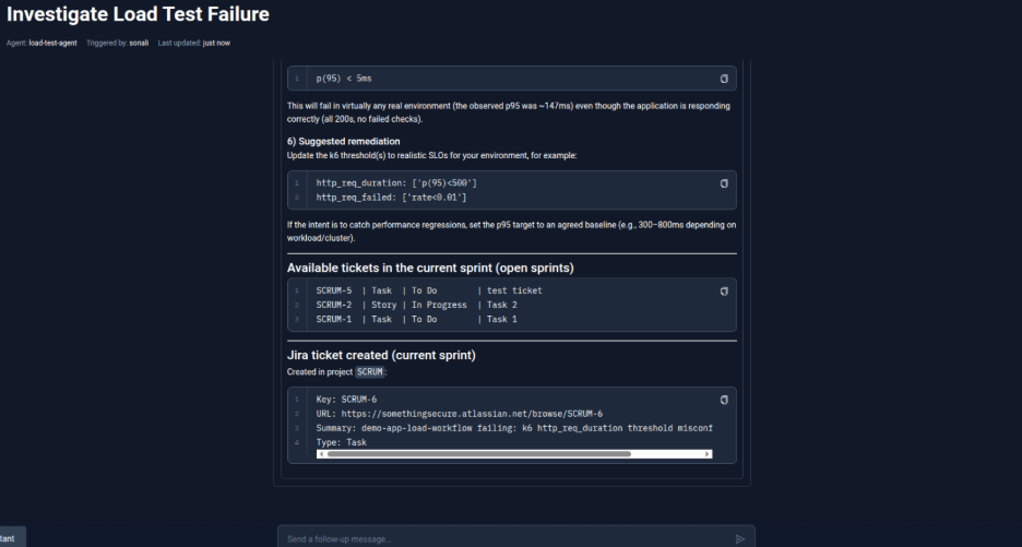 The agent uses the Jira MCP server to retrieve the current tickets as asked by user and then creates a ticket in the active sprint with a clear description of the failure (k6 threshold misconfiguration), including execution context, RCA findings, and actionable remediation steps. The agent provides details of the created ticket in the project "SCRUM" and respective URL to access to it.