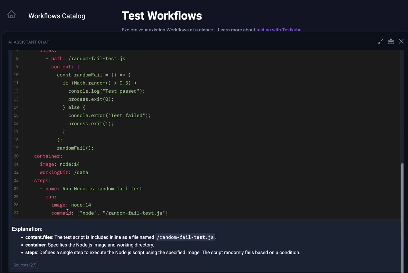 - Automated Test Workflows Generation with AI Assistant: Developers can use conversational AI to generate, optimize, and troubleshoot YAML configurations of Test Workflows for any testing tool or framework. For example, you can use AI to create workflows that would fail randomly to test a new workflow feature, rather than relying on existing 100% successful workflows.
