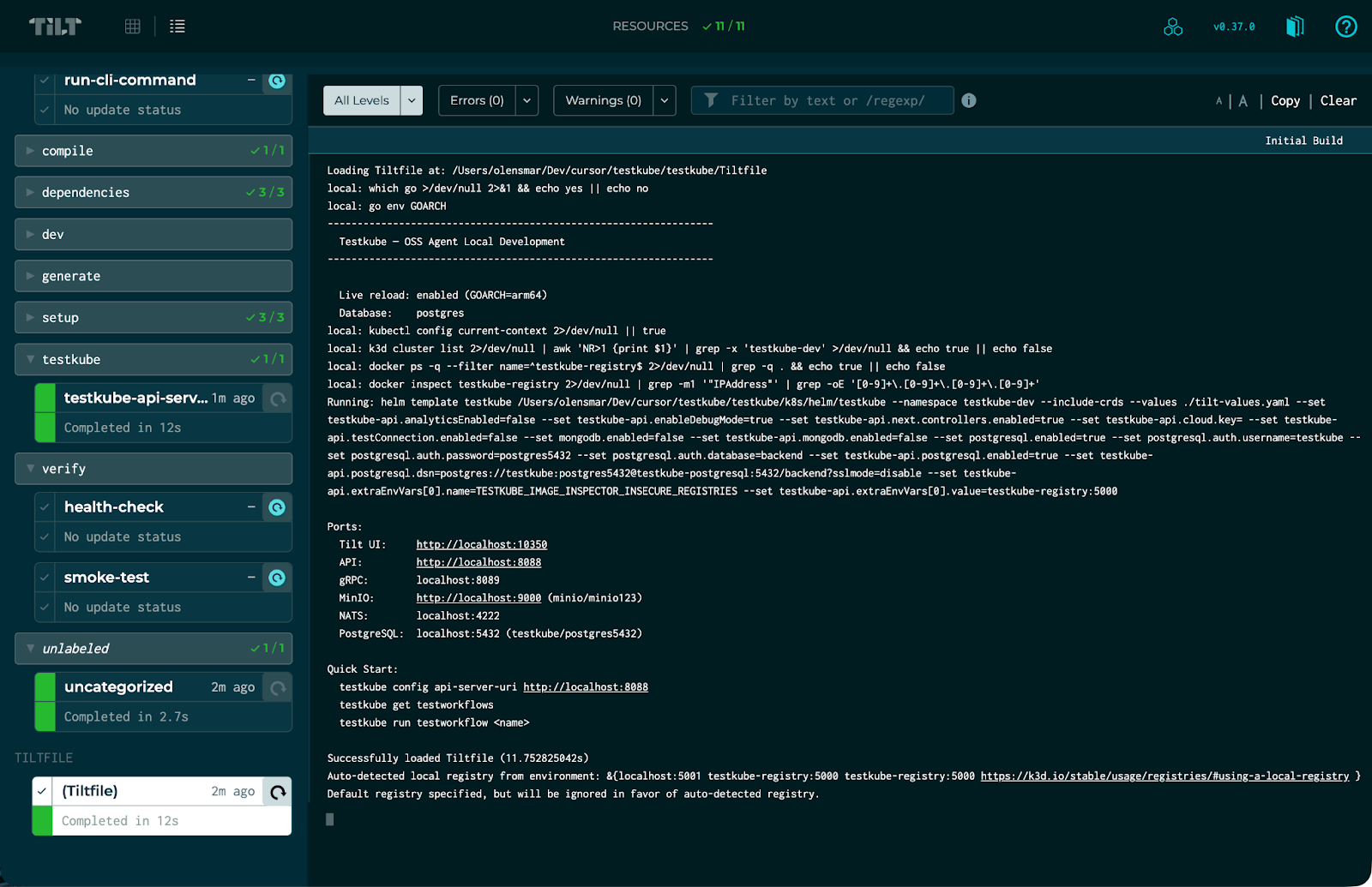 Tilt also compiles the Testkube CLI for your host OS. Point it at the local API server by triggering the configure-cli resource in the Tilt UI, then try: