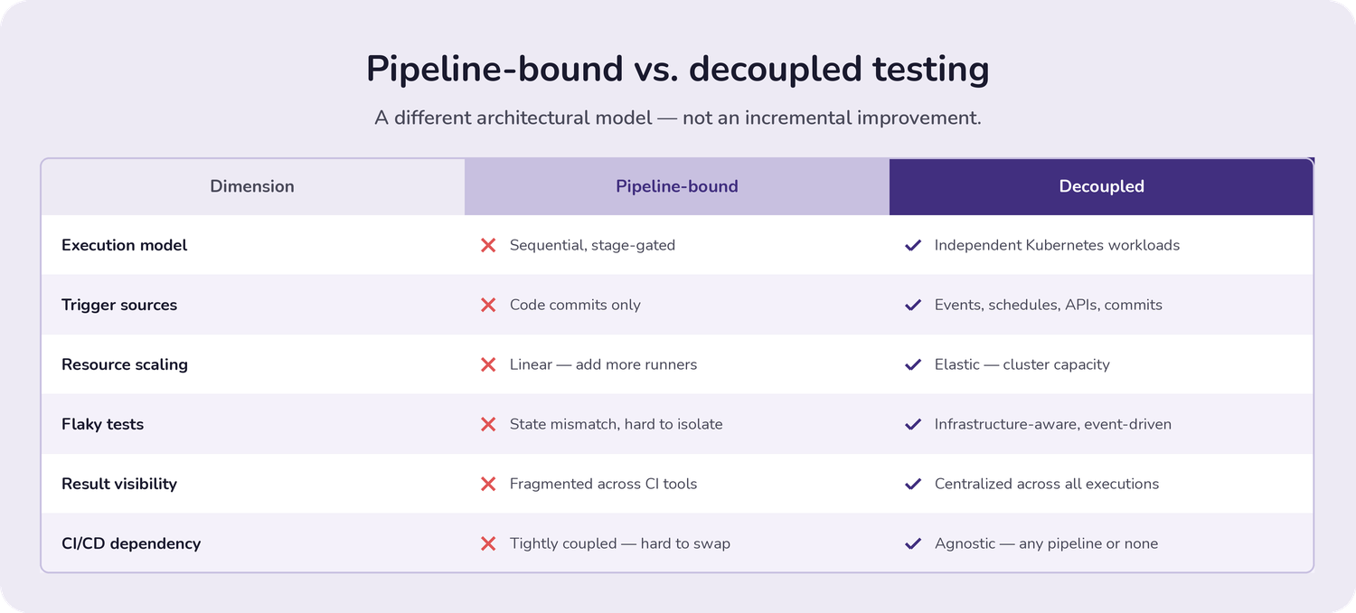 Decoupled testing treats testing as infrastructure, not a pipeline step. Tests run as Kubernetes workloads, triggered by events anywhere in the system, scaled independently of CI/CD capacity.