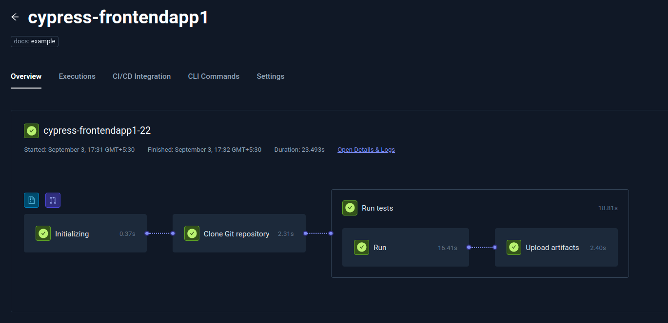 Select “Run” to view the test logs. The following image shows the execution of our test in the file cypress-test.cy.js.