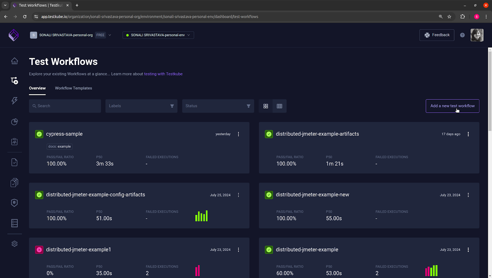 Testkube comes with pre-existing testing types, which include Cypress and Playwright. Let’s create our Cypress test first, for which we can use a repository as our source. Head over to Add a New Test Workflow in the Testkube Dashboard.