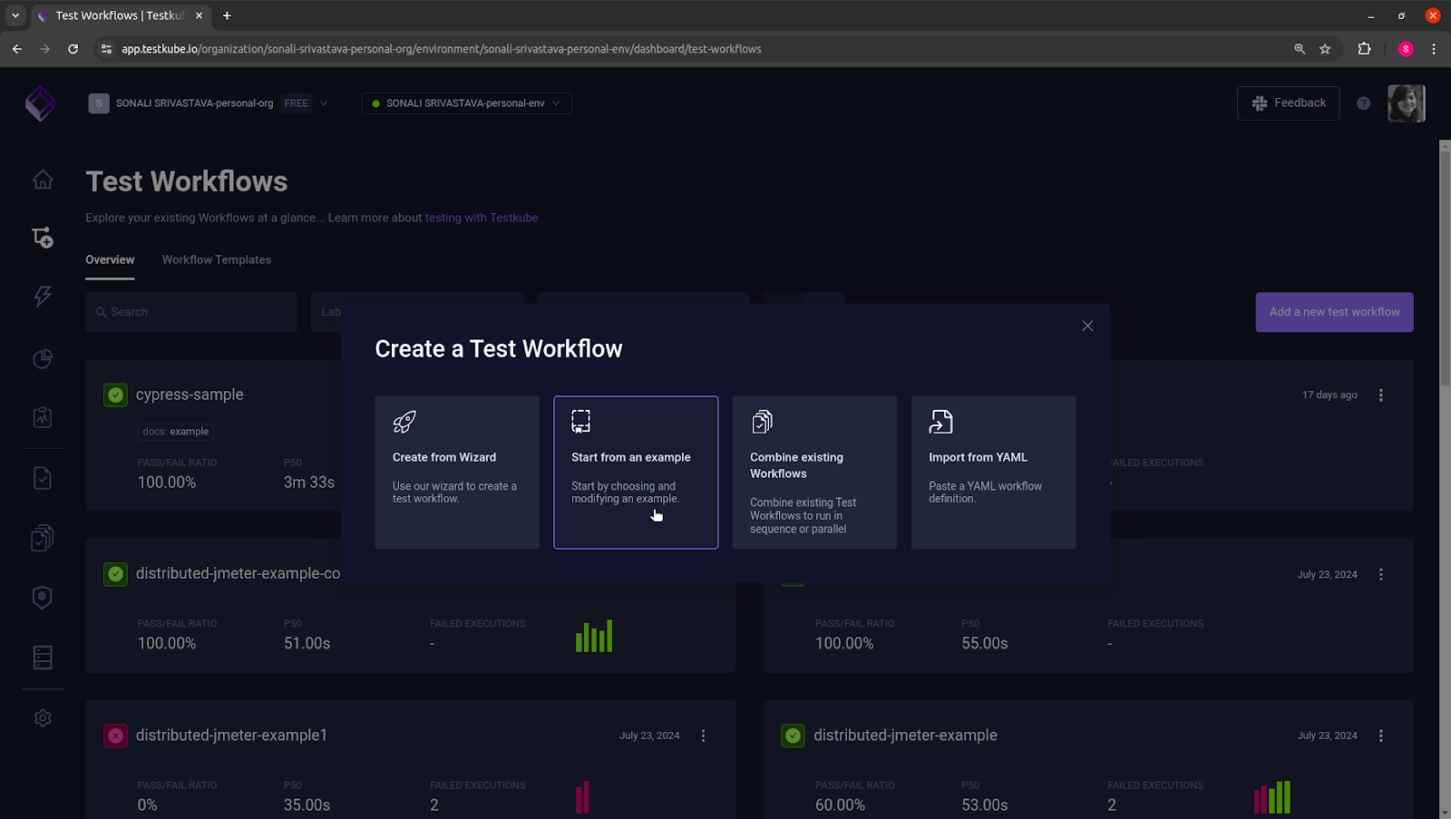 - Start from an Example: This option allows you to use a pre-configured example, such as k6, Playwright, Cypress, Playwright, Postman, and many others.