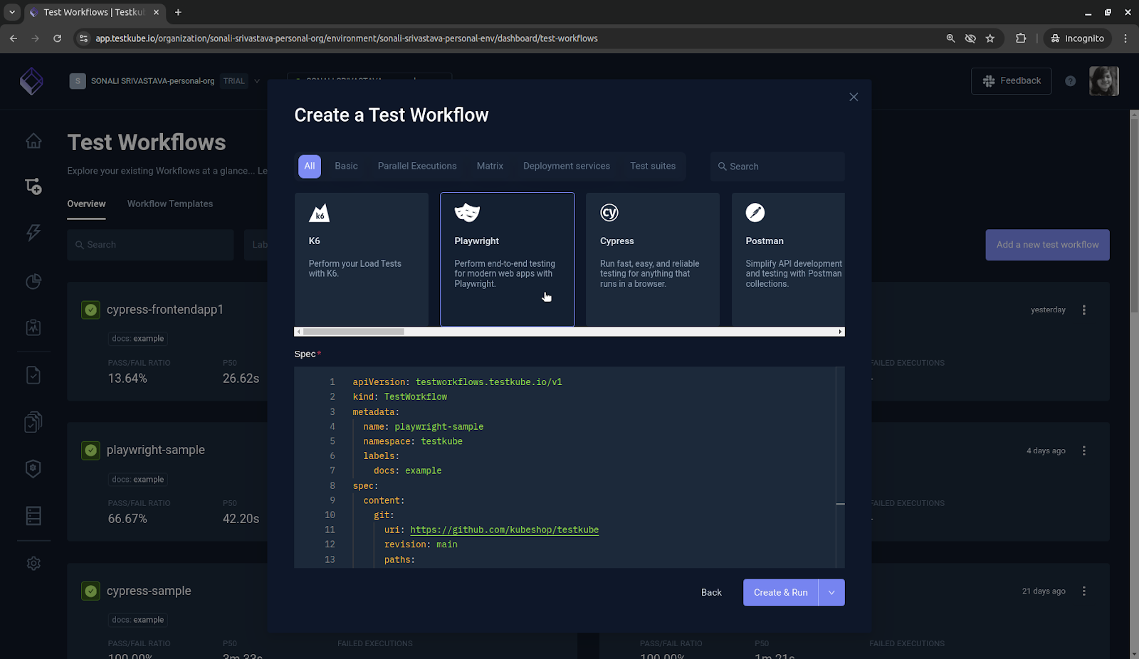 Create a Test Workflow in the Testkube Dashboard using “Playwright” example.