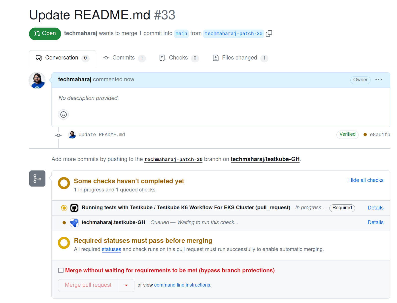 on the AKS cluster. - Based on the result, the status will be updated in the pull request. If the test passes, the merge option will be enabled, and anyone can merge it. However, if the test fails, the merge will not be available - we’ll configure a branch protection rule to prevent the PR from being merged if the run fails.