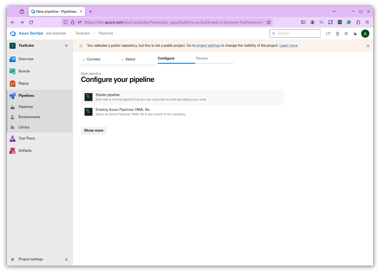 Integrating Testkube with Azure Pipelines follows a process similar to what we did for GitLab and CircleCI in the previous posts. In this case, we’ll configure Azure Pipelines with the GitHub Repo used in an earlier tutorial.