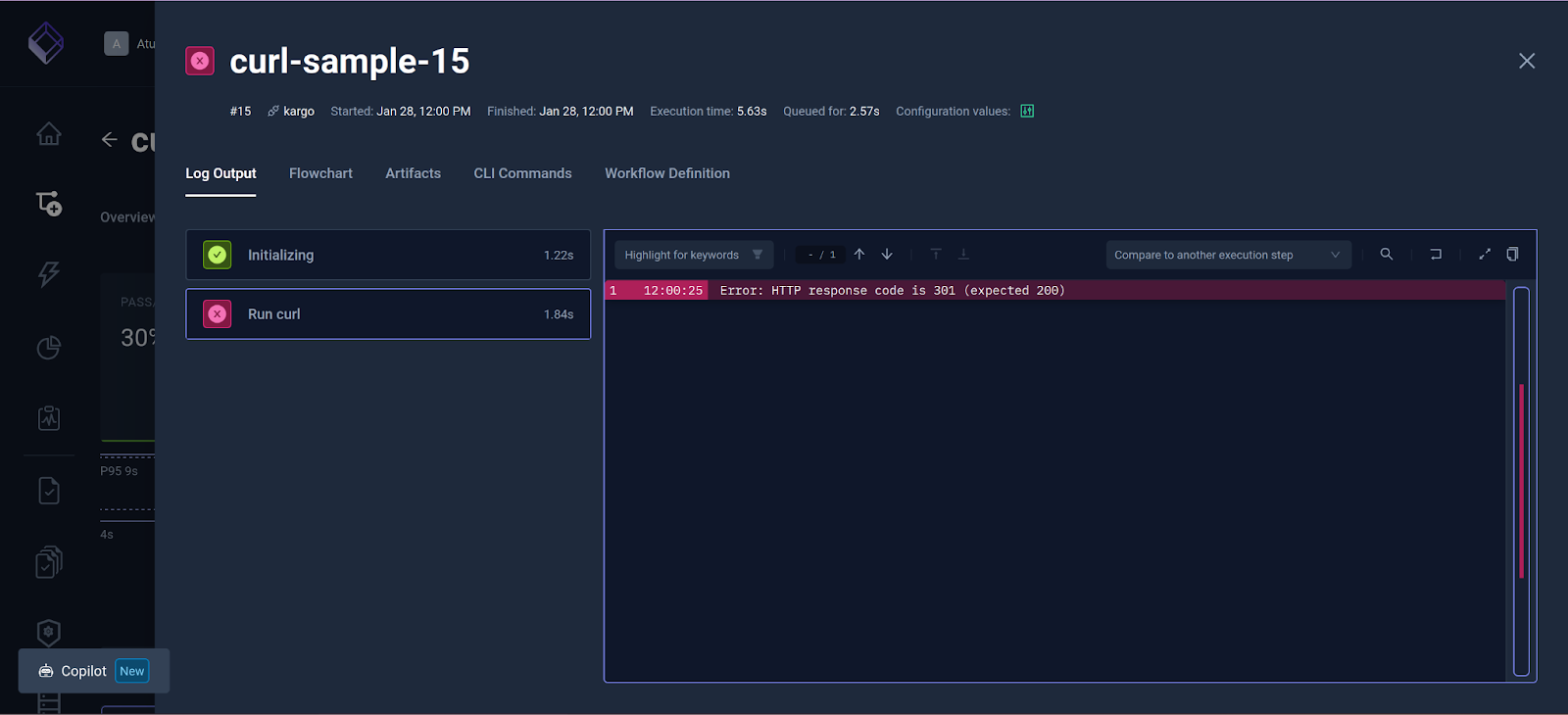 We see here that the task has failed. Let's also navigate to our Testkube dashboard and see if the Test Workflow actually executed.