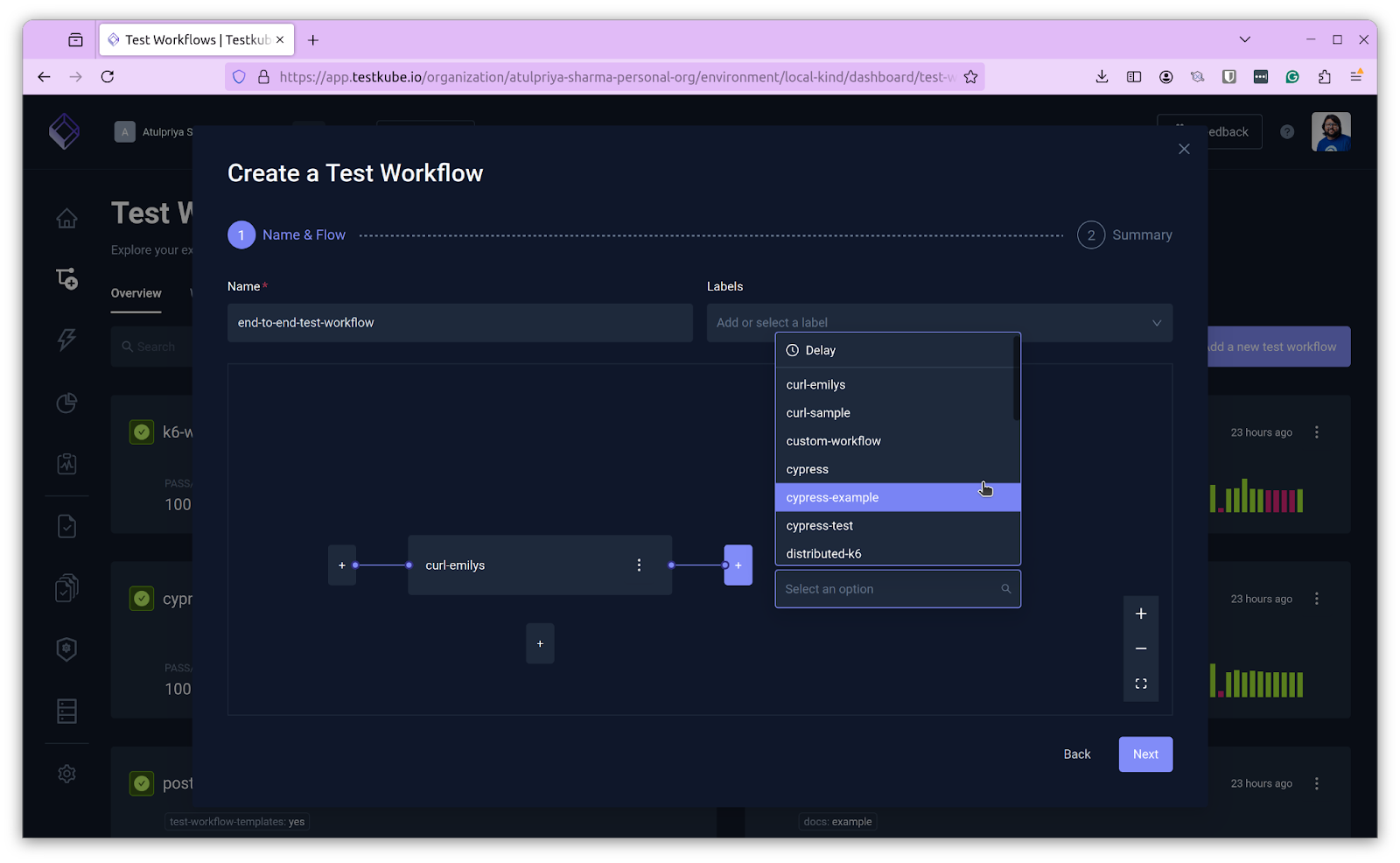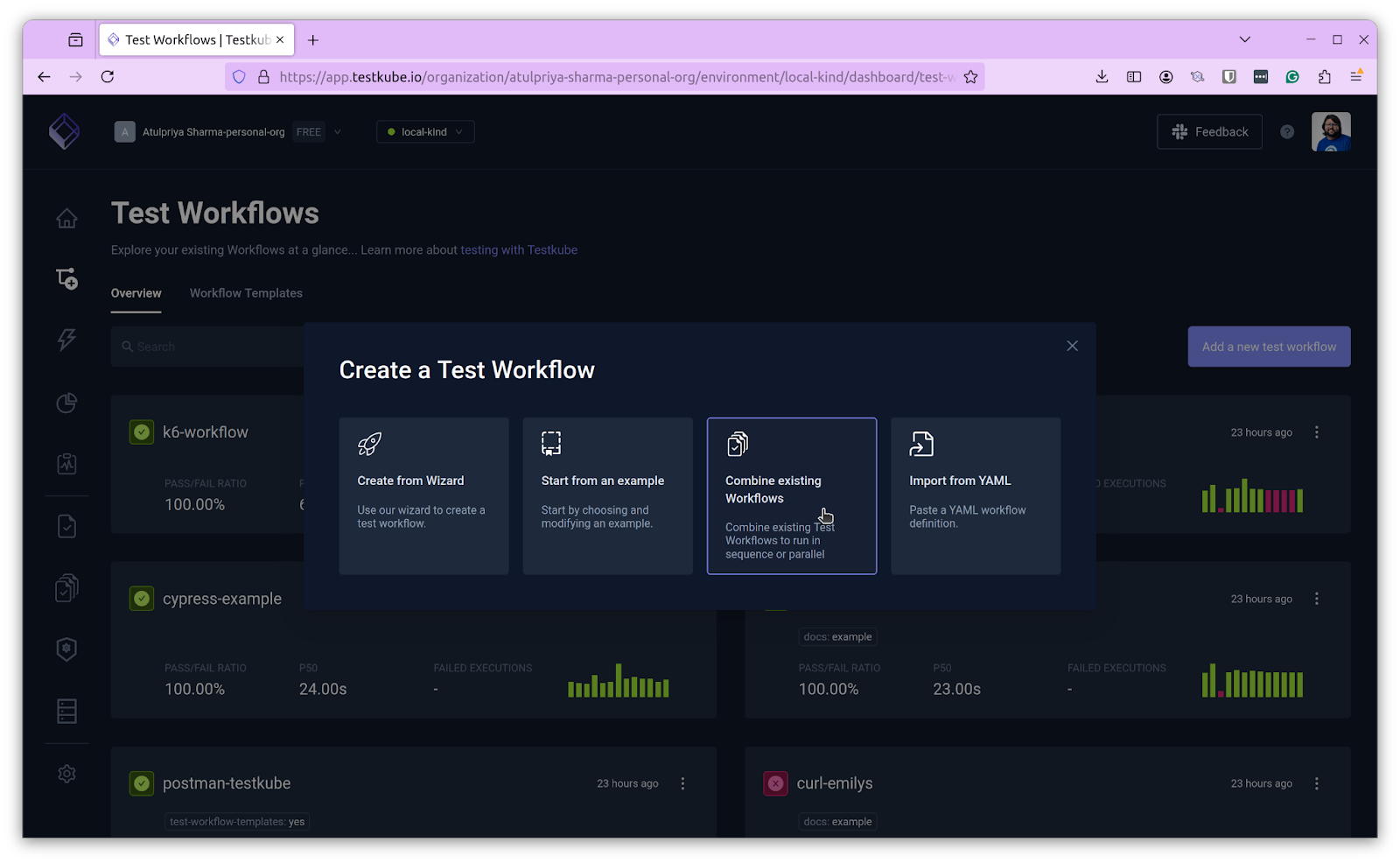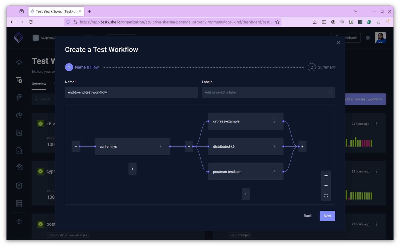 In the new tab, provide the name for the test workflow and click on the “Add the first workflow” button. Testkube provides an easy-to-use and intuitive interface for creating test workflows. This will give you a list of test workflows that you have already created, and you can choose one from the list. We’ll choose a cURL test workflow that we created, which tests login.