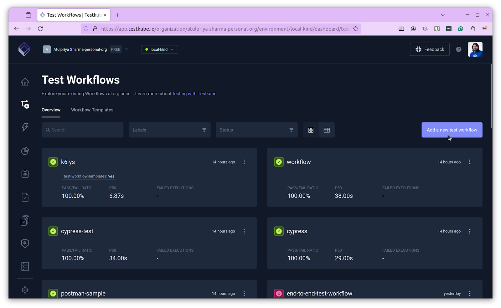 Login to Testkube, navigate to the Test Workflows tab for your local environment, and click the “Add a new test workflow” button.