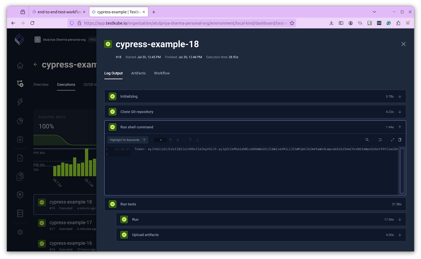 You can click on an individual workflow to see its status. For instance, we can check our cypress-example’s execution and see that it has fetched the token from the cURL test and executed the steps successfully.