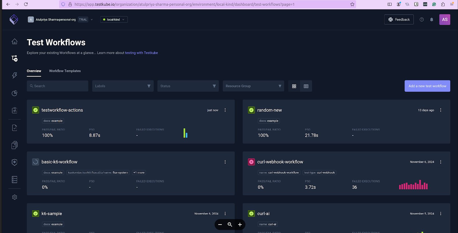 - Log in to your Testkube dashboard and navigate to the Test Workflow section.