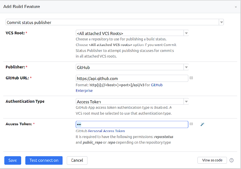 You can verify the configuration by connecting to the given VCS repository by clicking the “Test Connection” button.