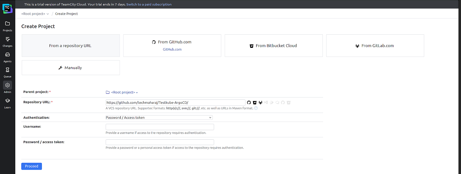 On the "Create a Project from a URL" page, enter the project name "Testkube Demo" and other details, then select the Proceed button.