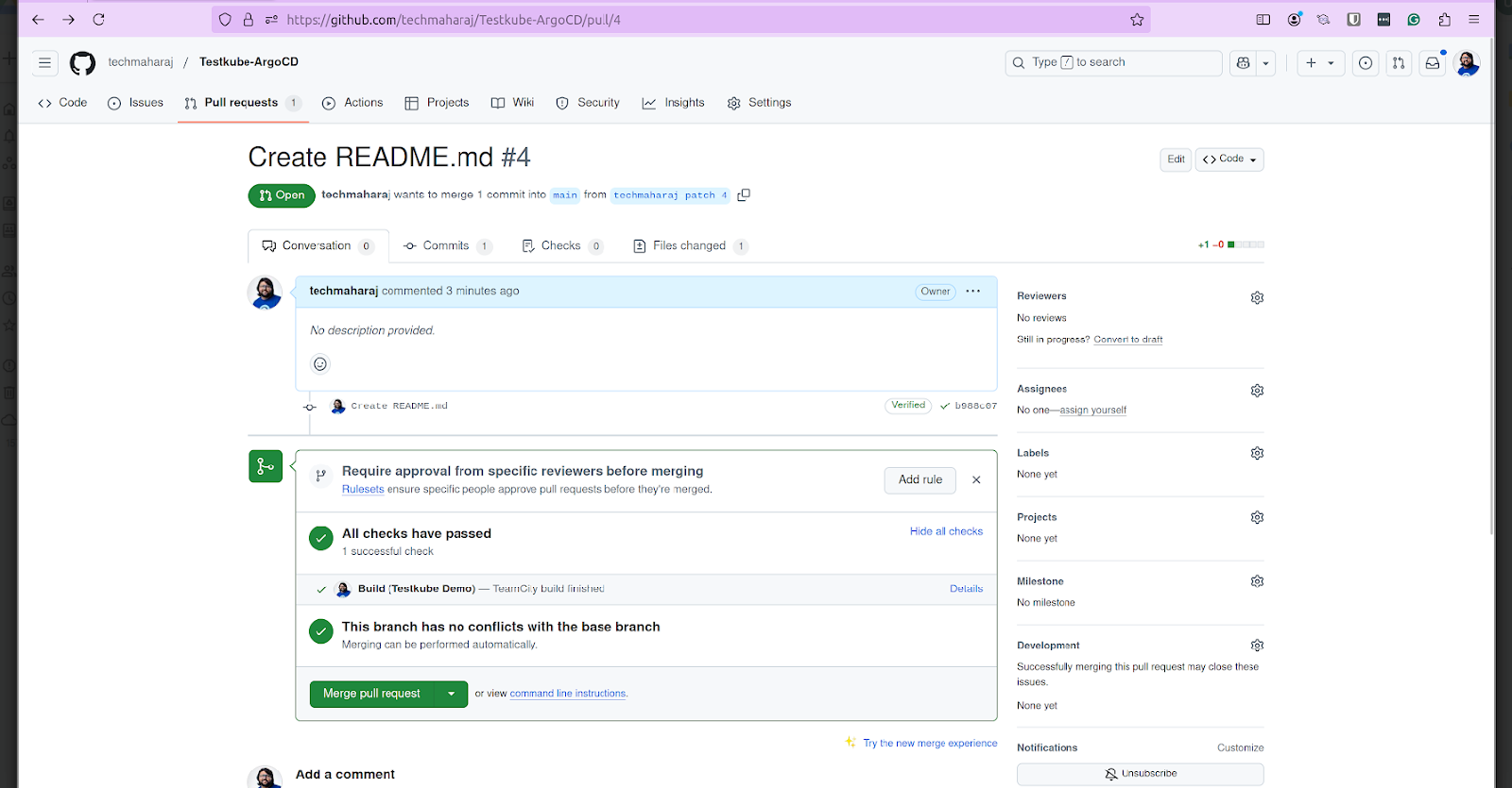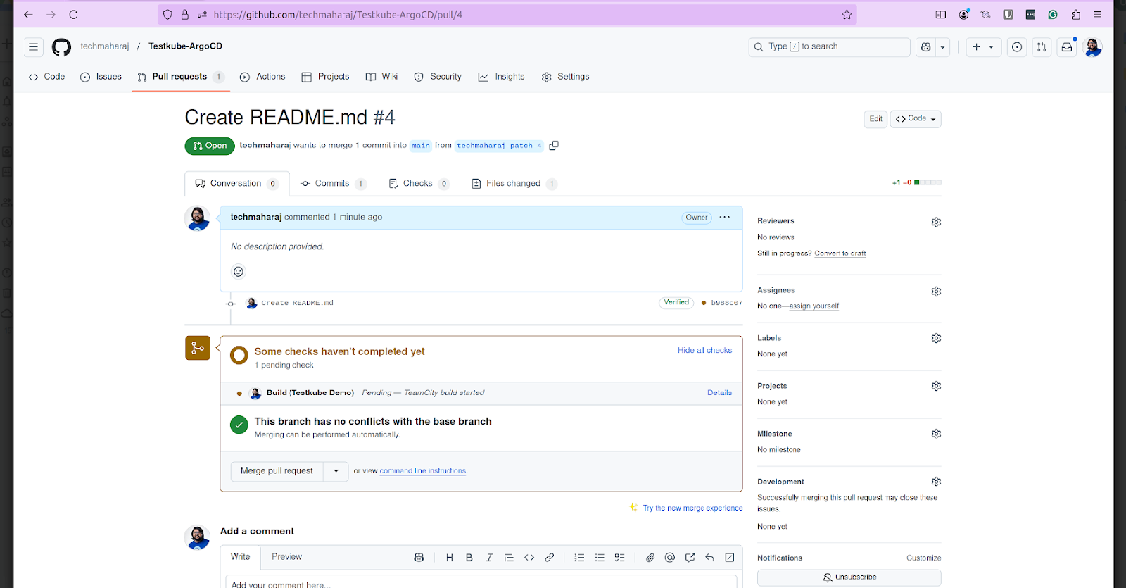 You can also verify the status of the pipeline execution on GitHub PR. This is because of the Build Feature that we configured, which enables TeamCity to update the build status for the GitHub PR.