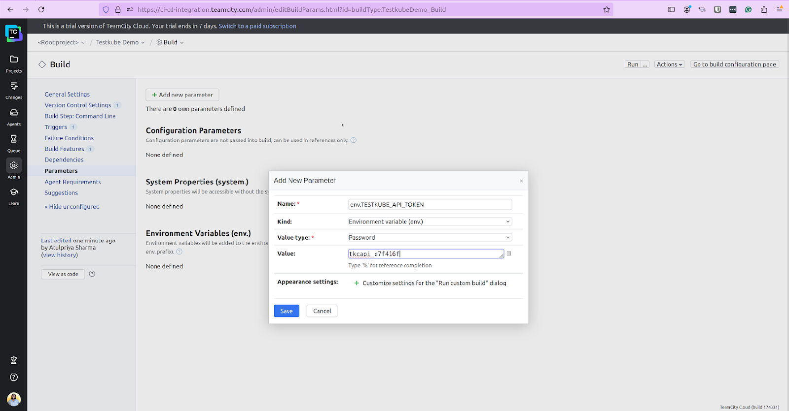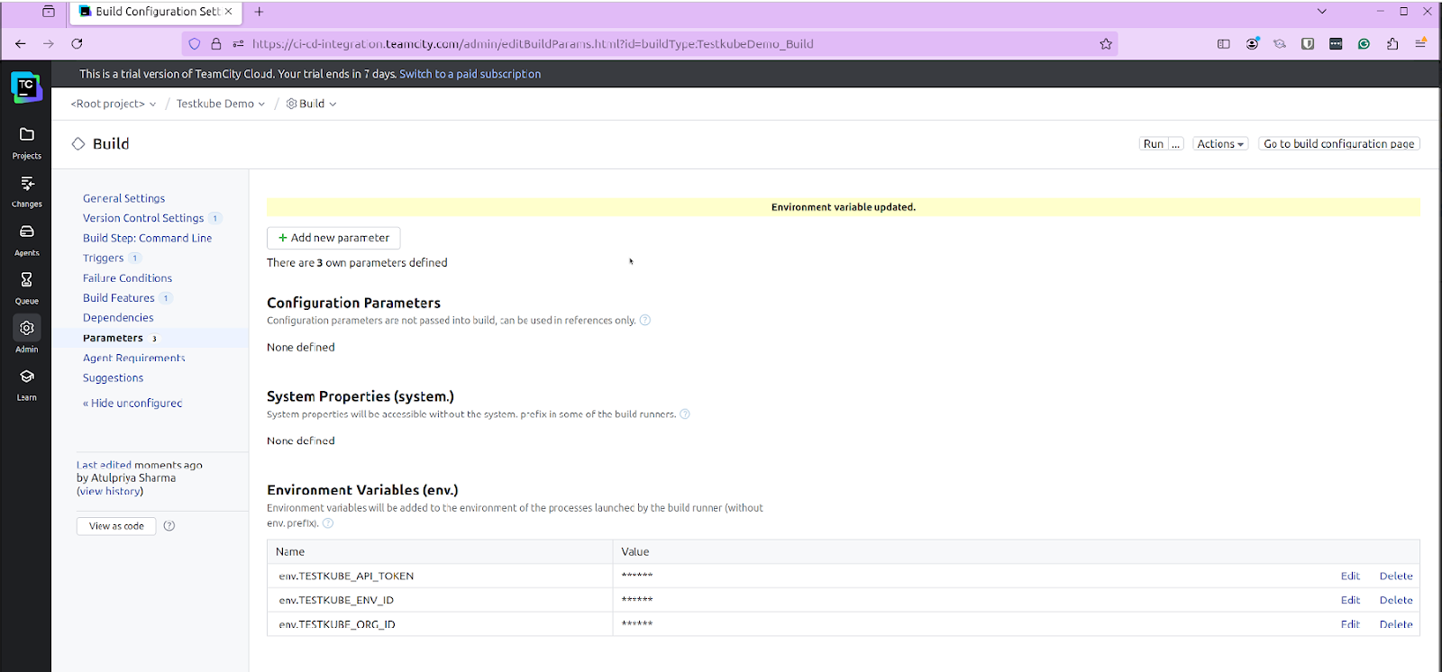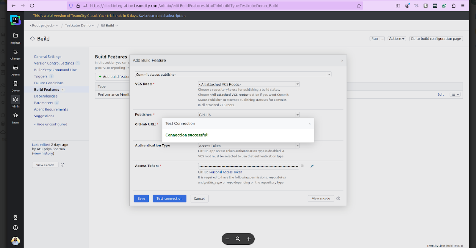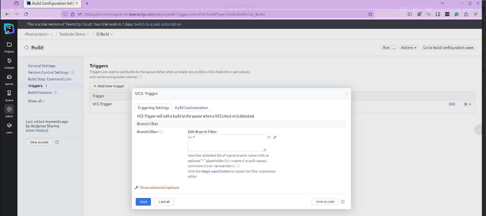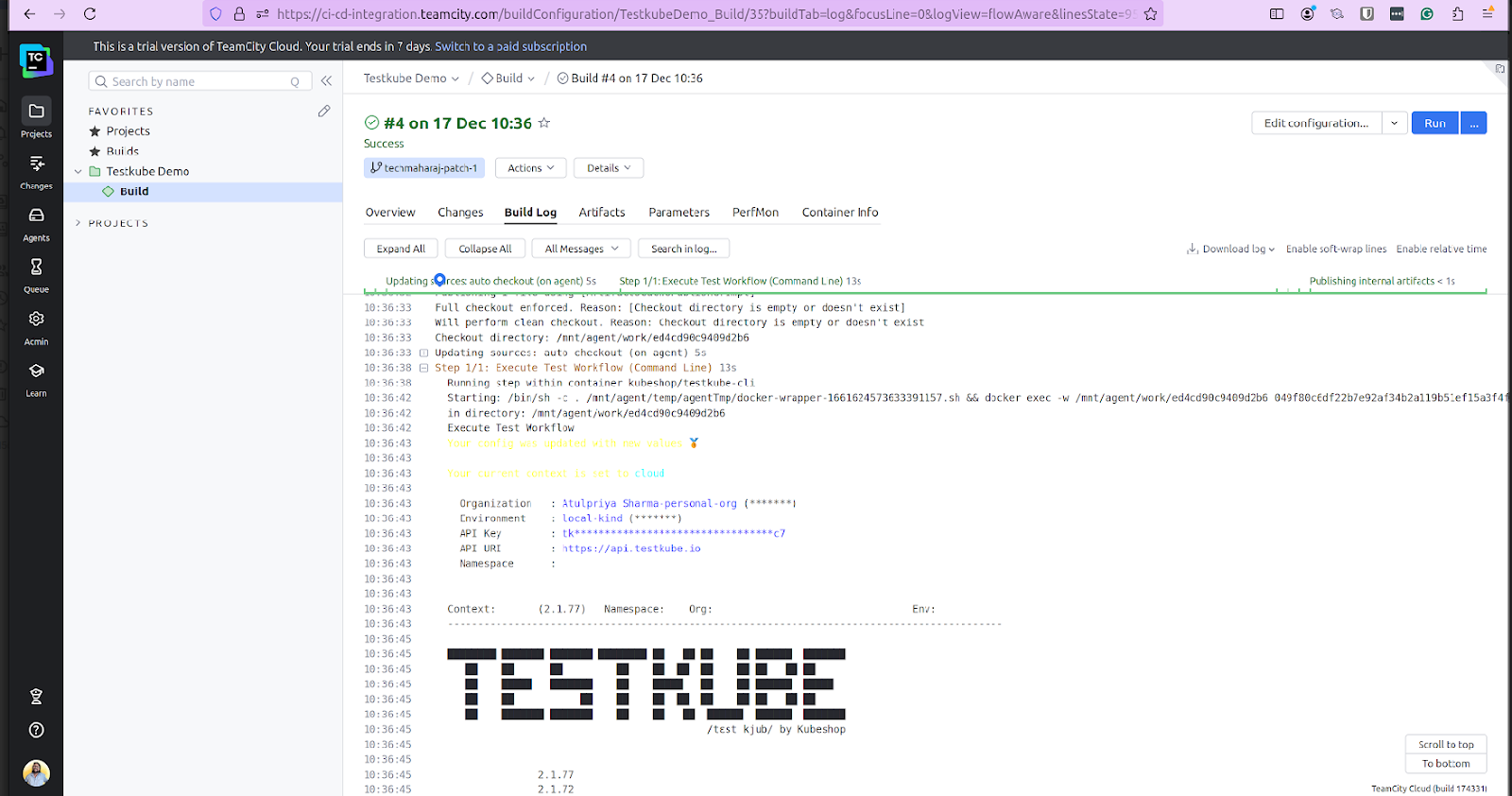 By following these steps, we have successfully configured your TeamCity pipeline to integrate with Testkube. This setup ensures that your build steps are properly defined and the VCS trigger is configured to monitor changes in your repo.
