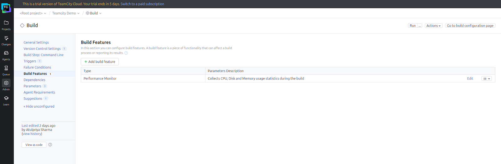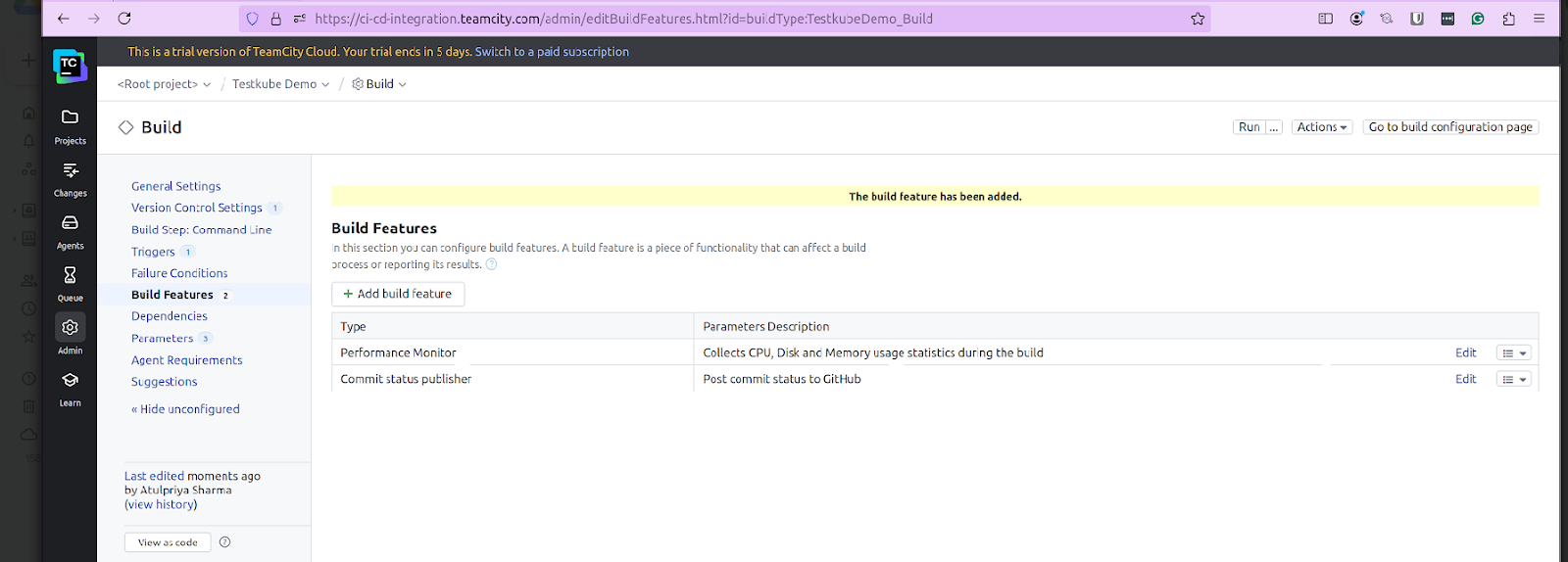 Once the build feature is configured, click the Save button to apply the changes. The build feature will be added to the list.