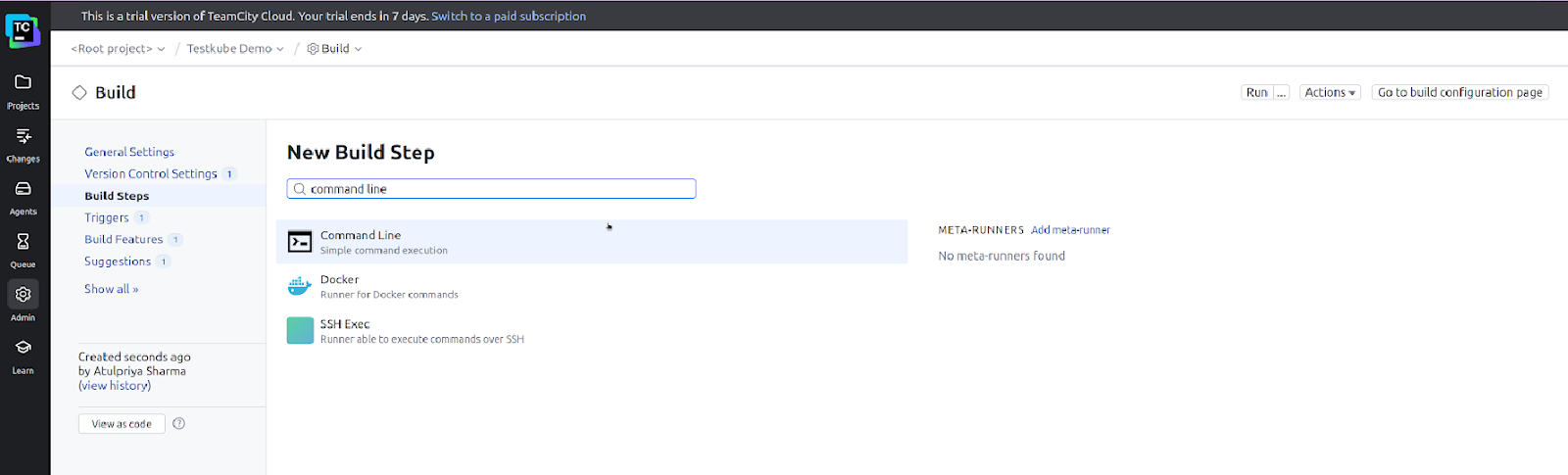 Since our repo doesn’t have a default build configuration, we will manually create a new build step. You can add a new build step to the build configuration by selecting a runner from the list or searching for it directly. Here, we'll use "Command Line" as a runner to execute shell commands or scripts.