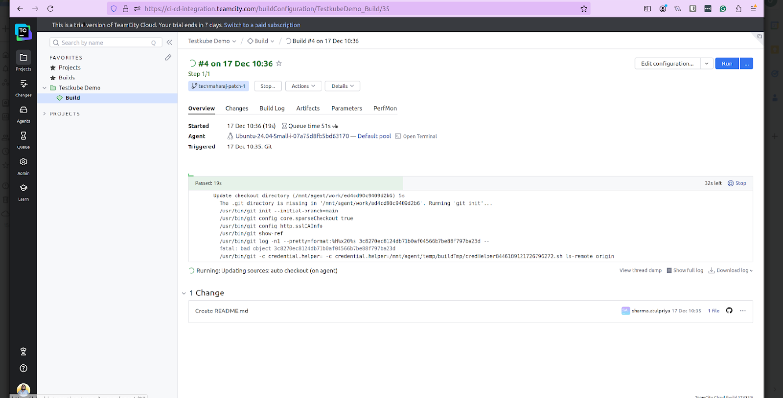 Once the pull request is created, the configured VCS Trigger in TeamCity automatically triggers the pipeline. The pipeline begins executing the steps defined in the build configuration file.