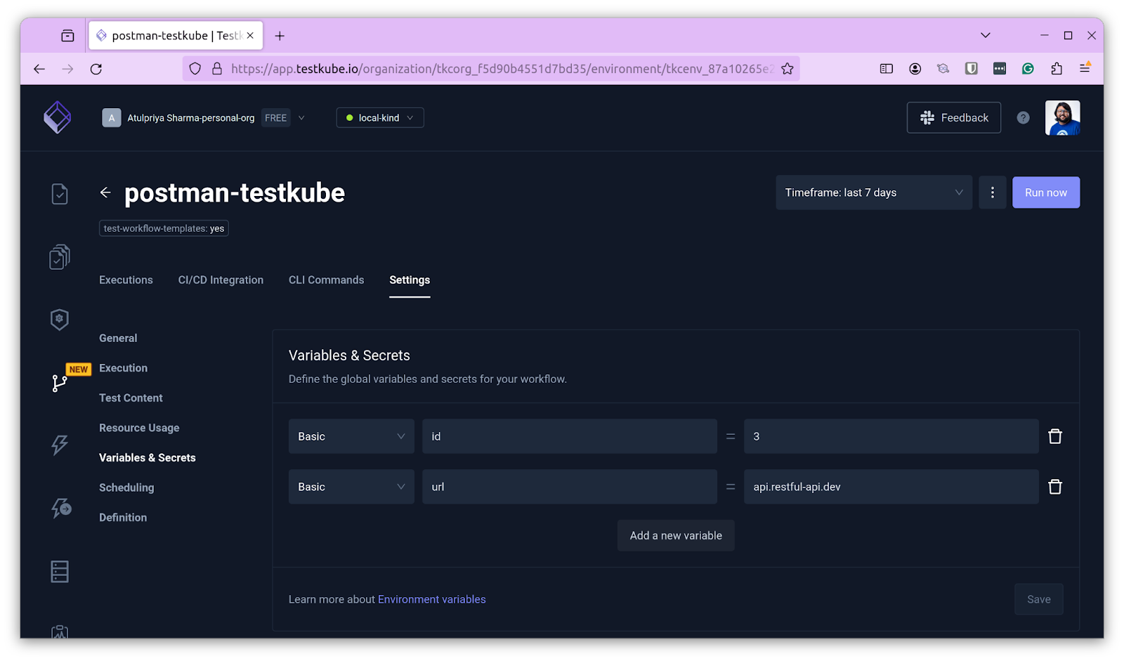 With this, you have configured the Test Workflow to use the value of “2” for id and “api.restful-api.dev” for url, respectively. You can tweak these variables based on your requirements.