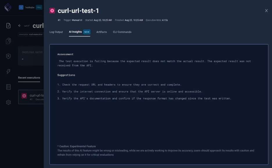 Leverage AI-driven insights to automatically identify patterns, anomalies, and performance trends in your tests. This helps teams detect regressions early and optimize performance without manual analysis. Testkube’s AI Analysis feature evaluates the issue and suggests resolution.
