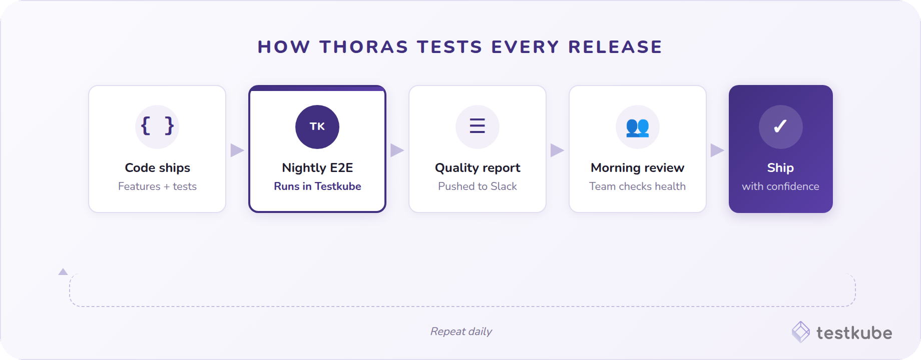For the Thoras team, testing isn’t an afterthought; it’s part of the delivery process itself. Every new feature ships with its own end-to-end tests, and those tests are treated just as seriously as the feature code.
