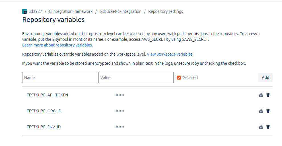 In addition, these IDs and tokens must be stored as variables in Bitbucket to ensure their safe access and use during pipeline execution. For more information, refer to the documentation on Bitbucket variables and secrets.