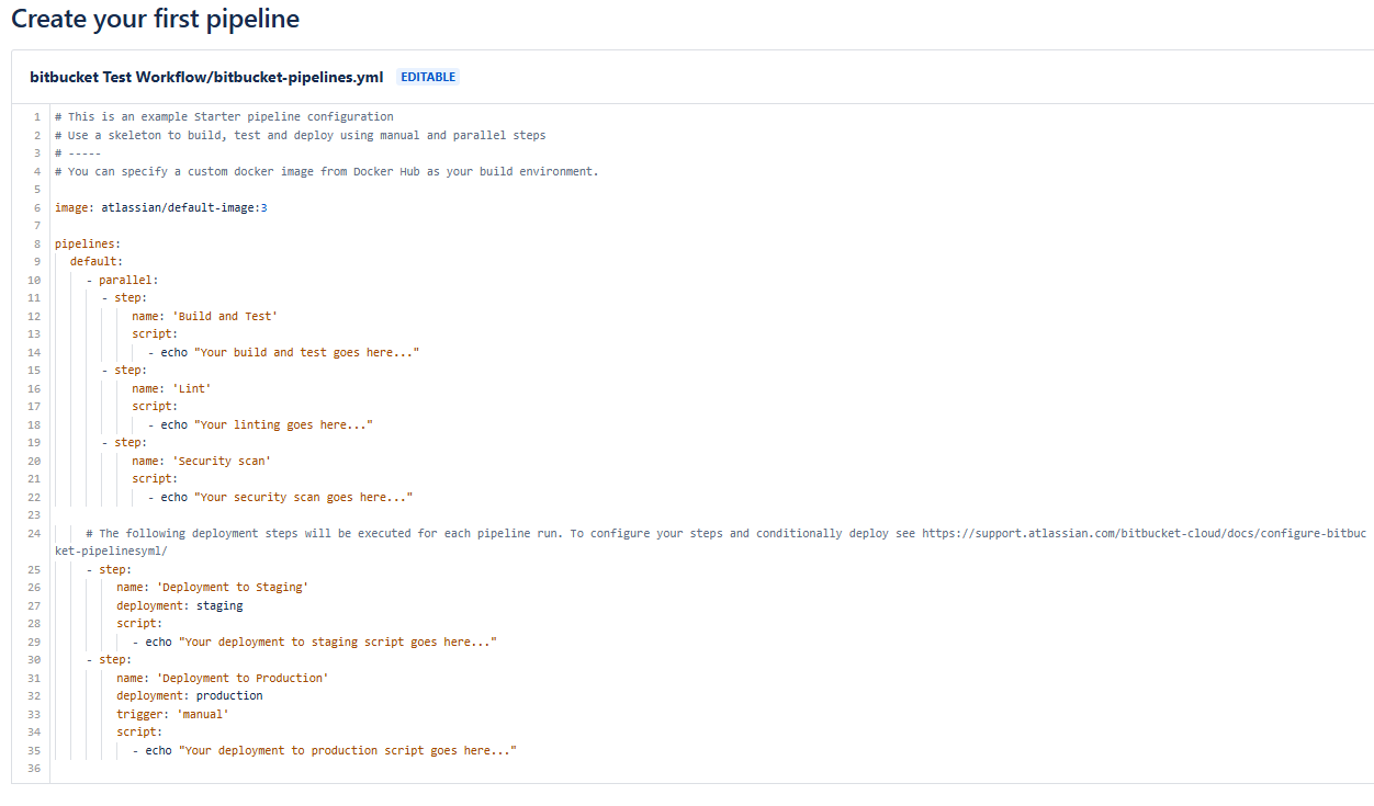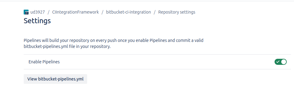 Once your repo has been created, go to Repository Settings and enable Pipelines. It will generate a sample bitbucket-pipelines.yml
