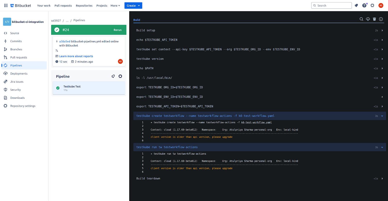 The above example demonstrates how simple configuring Testkube with Bitbucket Pipelines is. One can execute advanced scenarios by modifying the workflow and configuring repositories according to their specific requirements.