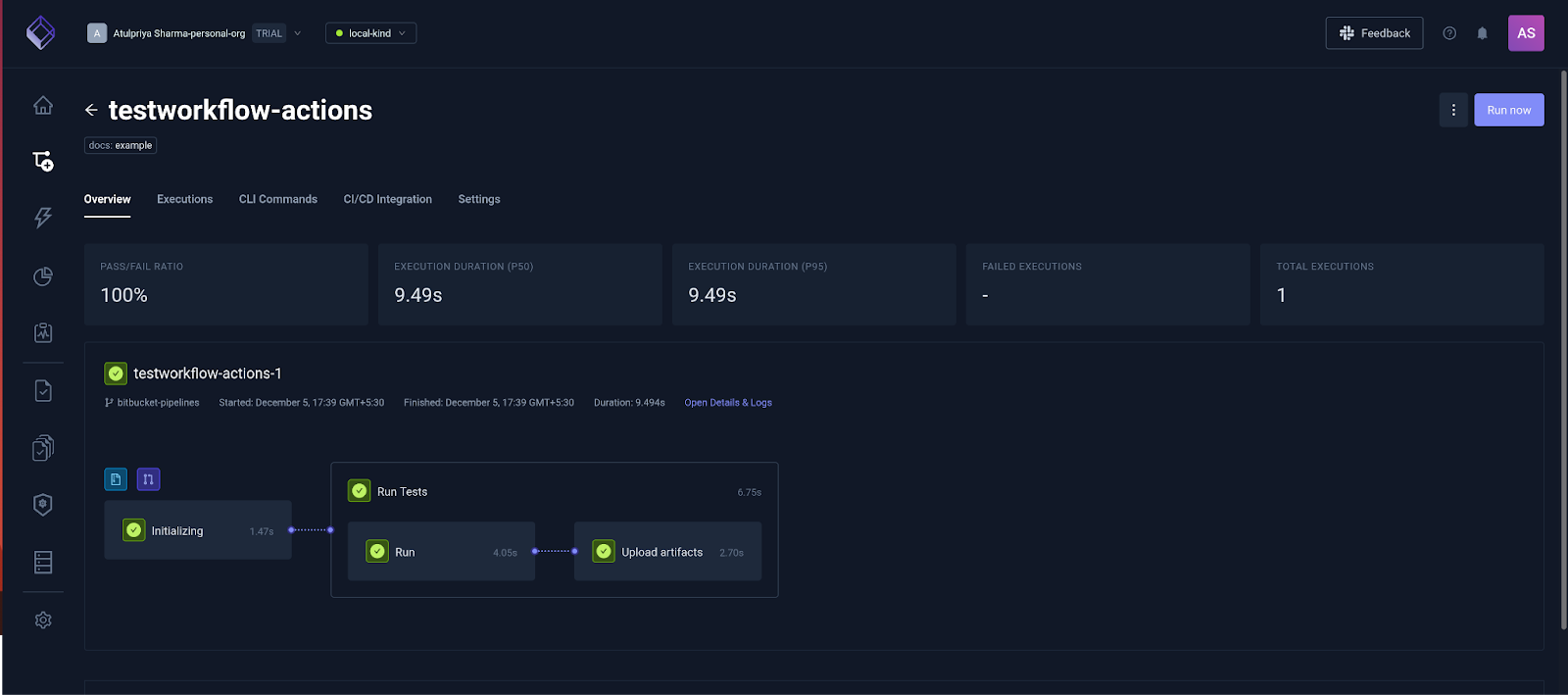 Note: The --update flag in the run test workflow command ensures that the test workflow is updated with the latest changes and execution history is preserved