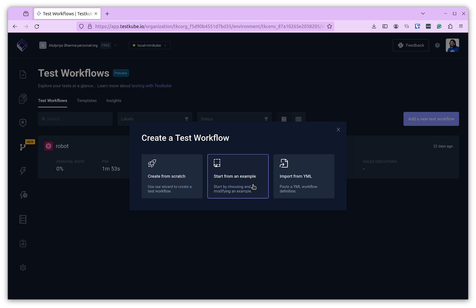 In order to create a test workflow, you need to have a cluster running along with the Testkube agent. When you have this running, you can log in to the Testkube dashboard, click on Test Workflows and “Add A New Test Workflow” and choose “Start From An Example”